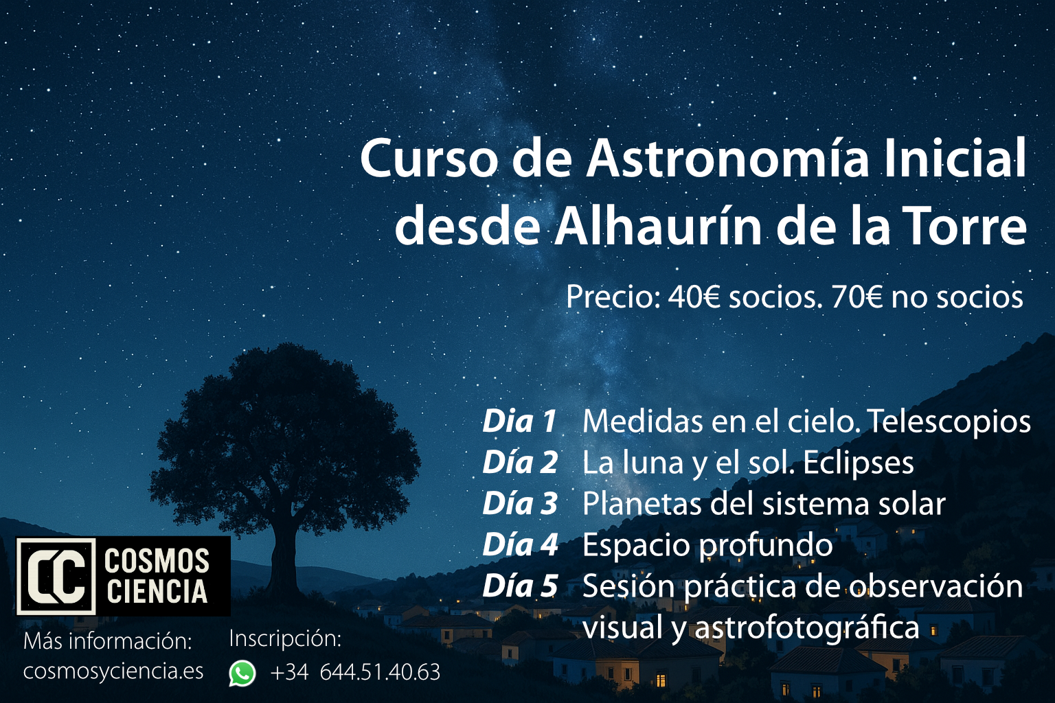 Curso de Astronomía Inicial donde aprenderás a usar telescopios, medir el cielo, identificar objetos celestes y observar objetos de espacio profundo. Incluye sesión práctica con observación visual y astrofotografía. Ideal para quienes ya tienen nociones básicas. Plazas limitadas.
